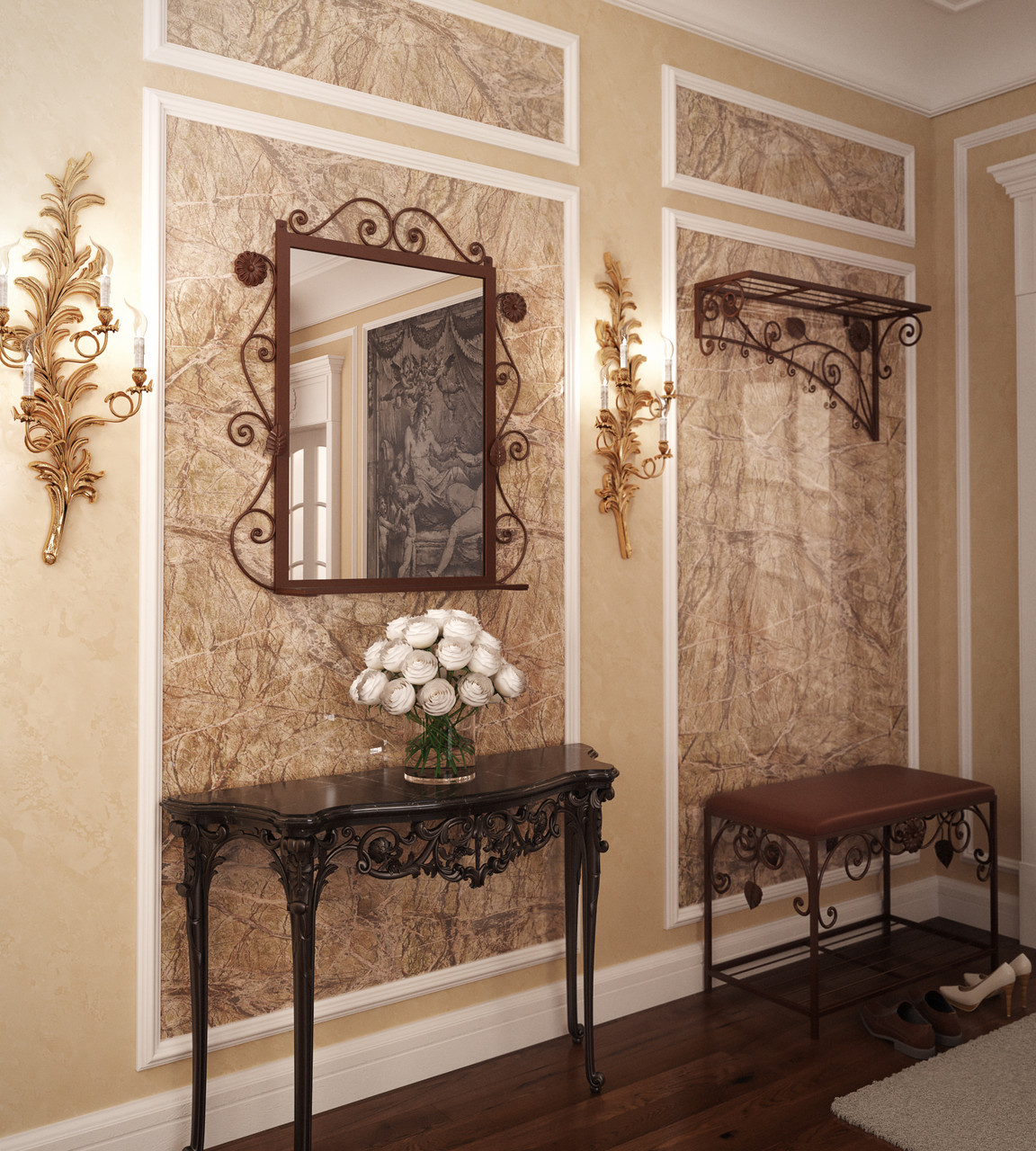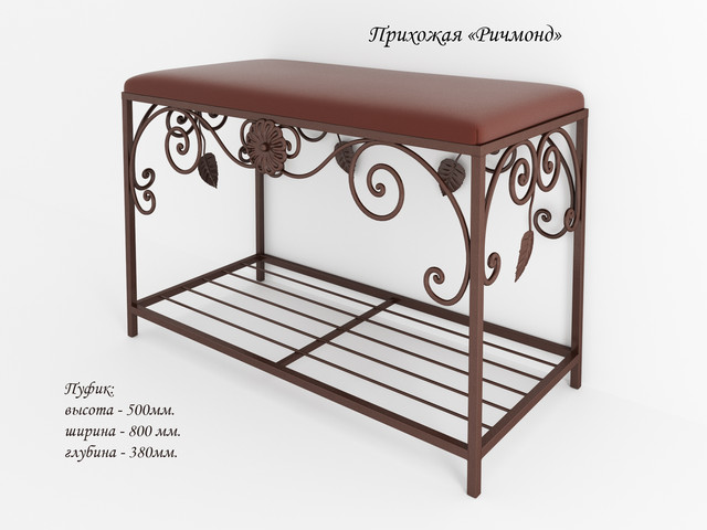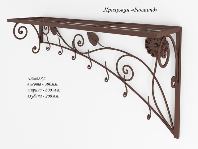 Відмінний варіант для мебелірованни інтер'єру в «замковому» стилі. На тлі фактурного каменю витіюваті візерунки кованого металу будуть виглядати чудово! Передпокій компактна, але дуже містка. Є все необхідне для зберігання речей: поличка для головних уборів, гачки для верхнього одягу, м'яке зручне сидіння і полку для взуття. Ідеальний варіант для готелів та будинків відпочинку, а також для житлових малогабаритних приміщень.